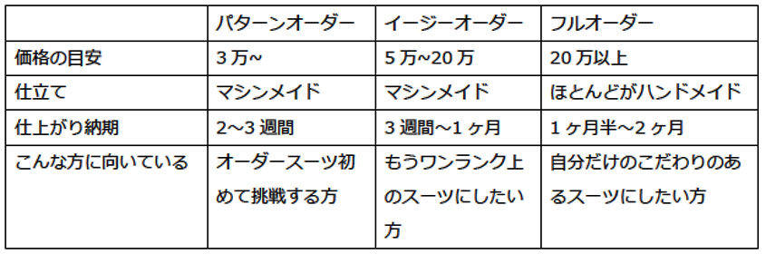 すべてのオーダー種類があるお店は少ないので、必ず取り扱いのオーダー種類を確認しておきましょう。値段や仕立て方、納期も変わるので注意が必要です。