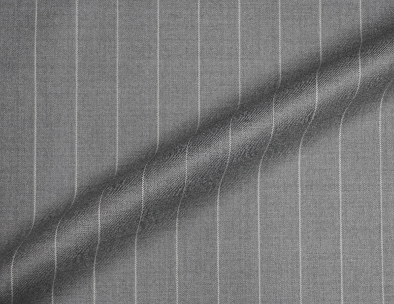 ゼニア15ミルミル生地のライトグレーの2.0㎝間隔ピンストライプ。貫禄を演出するに打ってつけの色柄。極上の15ミルミルで仕立ててはいかがでしょうか。