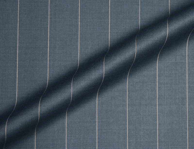ゼニアトロフェオ生地のブルーグレーのワイドストライプ。春夏らしい明るいグリーンがかったブルーグレーとストライプがマッチ。爽やかなコーディネートがおすすめです。