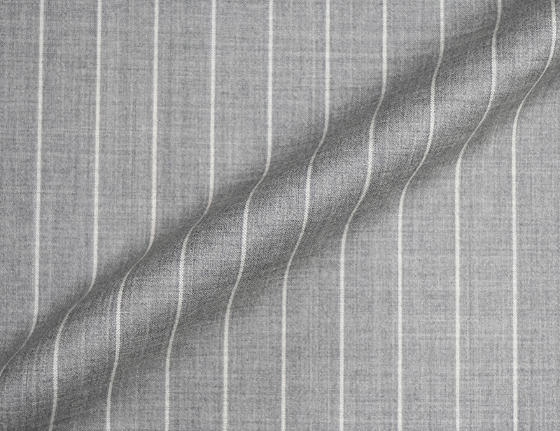 ゼニアトロピカル生地のライトグレーのペンシルストライプ。ノーネクタイでの着用でも様になるのでクールビズに重宝できます。